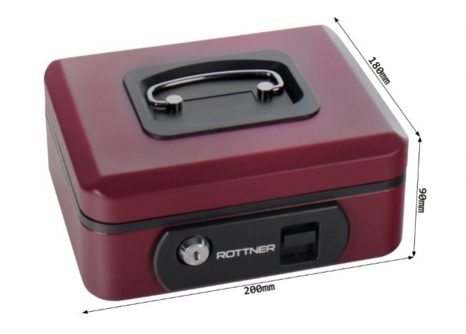 • Pokladnička Rottner disponuje klasickým cylindrickým zámkom. Zámok má tlačidlo, ktoré po stlačení automaticky otvorí veko pokladničky. Vo vnútri pokladničky je miesto na mince a bankovky rôznych nominálnych hodnôt. Vnútornú plastovú priehradku je možné v prípade potreby vybrať. Zapustená rukoväť umožňuje ľahký a pohodlný prenos.